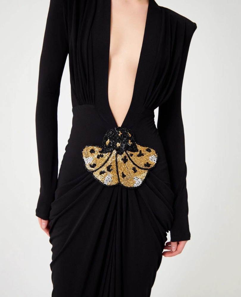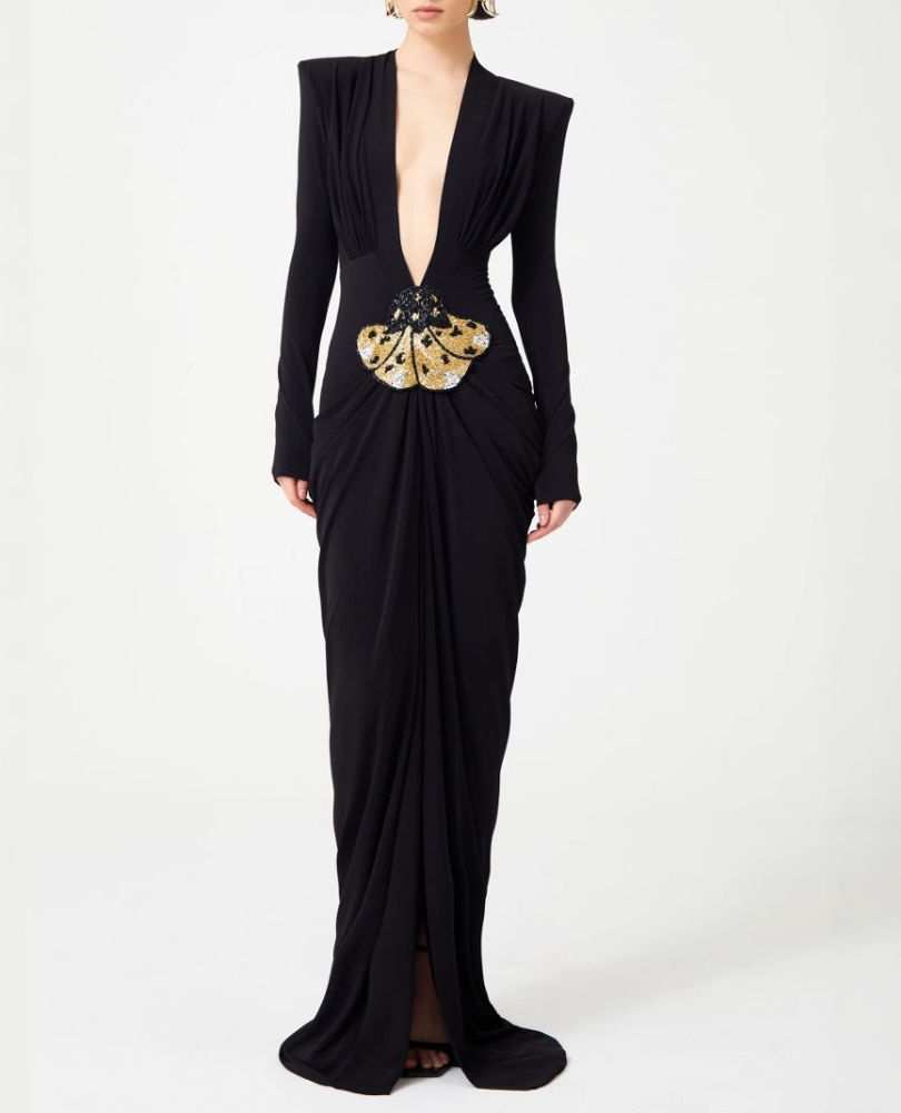 - Delicate gold jewelry to accentuate the V-neck.