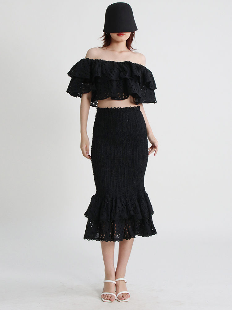 Two Piece Set, Slash Neck Hollow Out Top, Asymmetrical Ruffles, Cotton Polyester