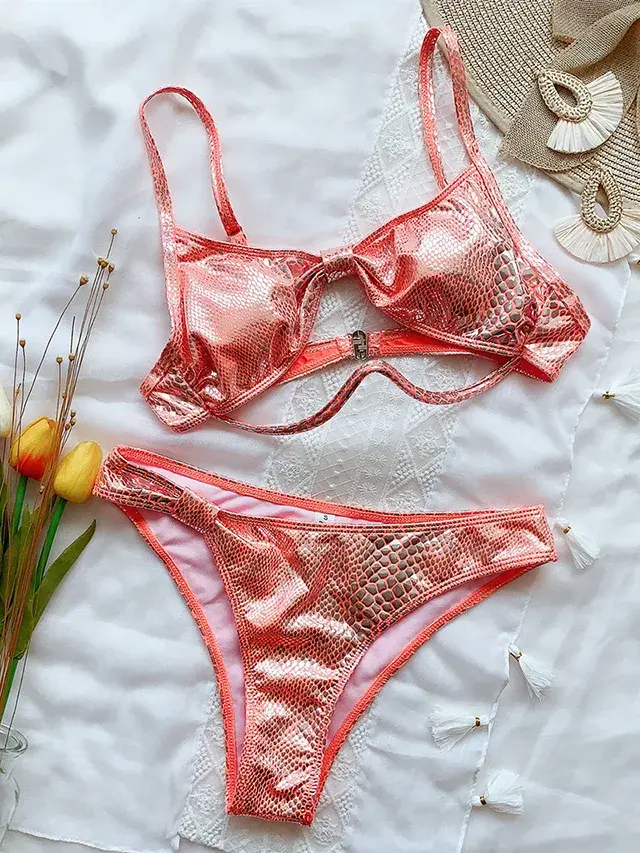 Underwire V-Bar Bikini Swimsuit Snake Skin Print Two Piece