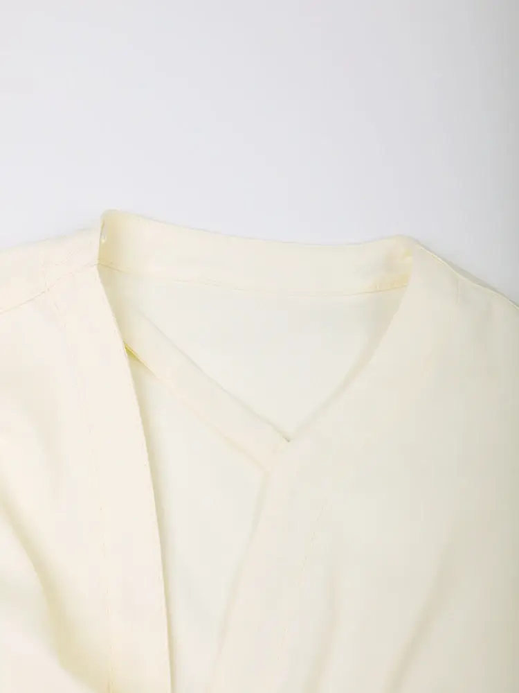 This relaxed-fit shirt offers effortless style with a comfortable V-neck collar. Made from a breathable cotton-polyester blend, it features long sleeves for year-round wear. The non-stretch fabric drapes beautifully for a flattering silhouette, while the V-neck adds a touch of feminine flair. Available in a light yellow shade, this shirt is a perfect addition to your spring and summer wardrobe.