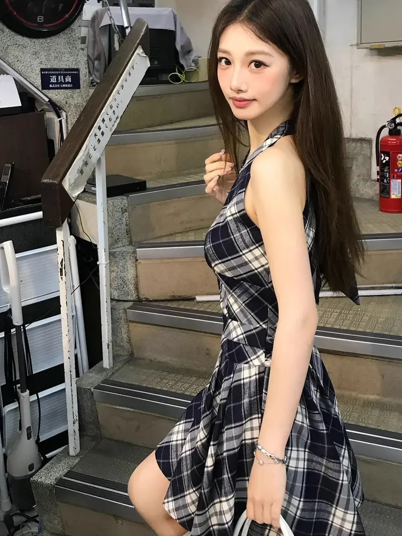 Tags:V neck plaid mini dress, women's streetwear dress, summer A-line dress, pleated vestidos, vintage mini dress, sleeveless plaid dress, Korean style dress, empire waist dress, black plaid dress, junior fashion dress, spring summer mini dress, women's casual mini dress, A-line silhouette dress, short plaid sun dress.