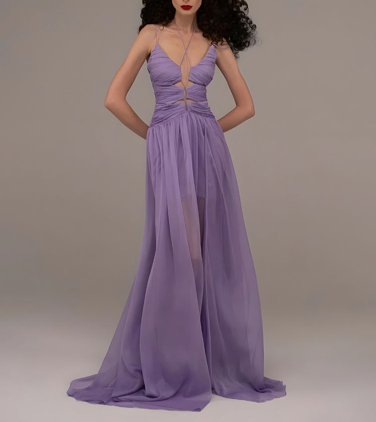 Halter Neck Ankle-Length Dress, A-Line Spaghetti Strap Gown, Purple Chiffon