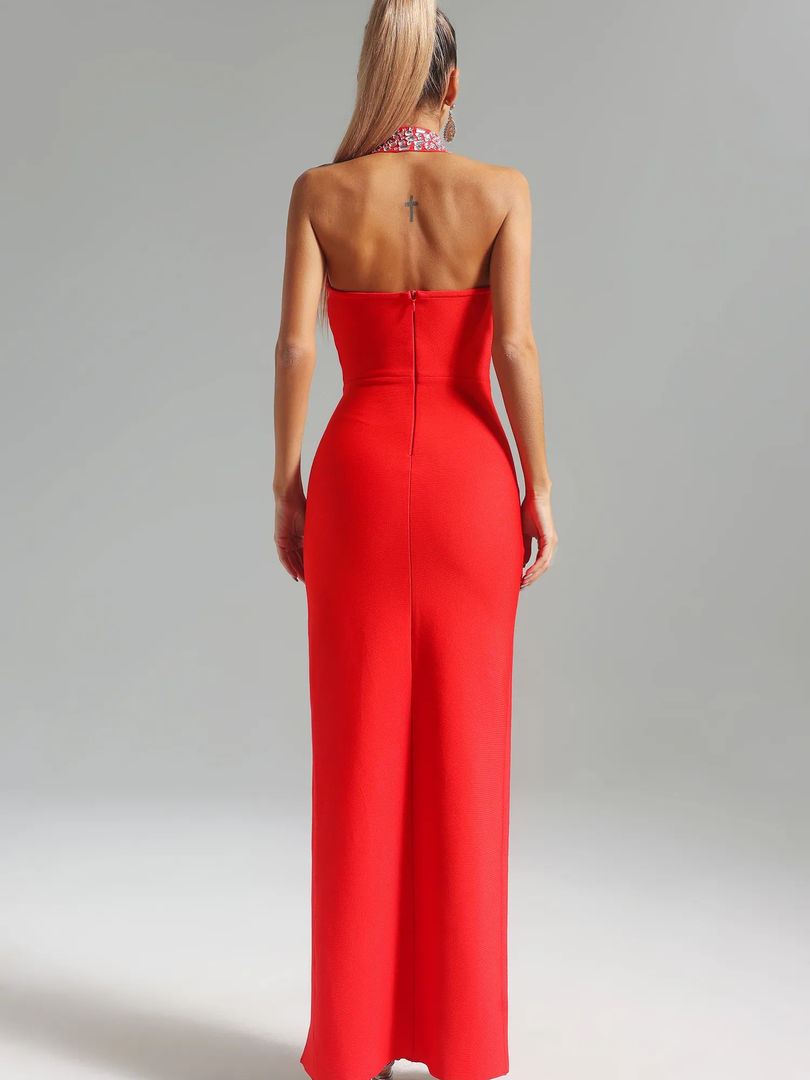 Red Halter V-Neck Ankle-Length Dress with Diamond Studded Slit & Backless Design