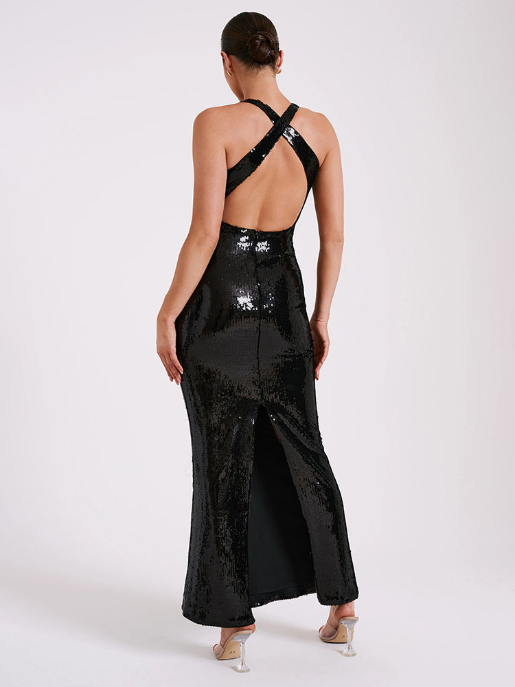 Sleeveless V-Neck Ankle-Length Dress, Slim Fit, Backless, Sequins, Knit, Cotton