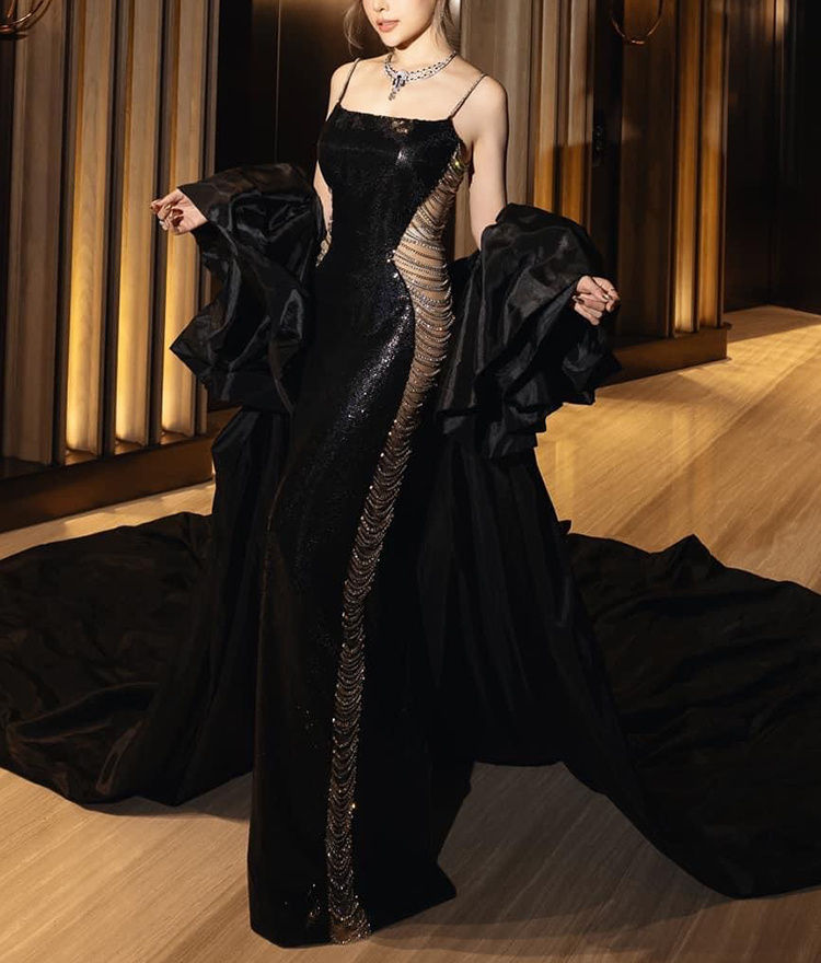 Black Backless Long Dress Sequins Chains Spaghetti Straps Cut Out Hollow Out Kni