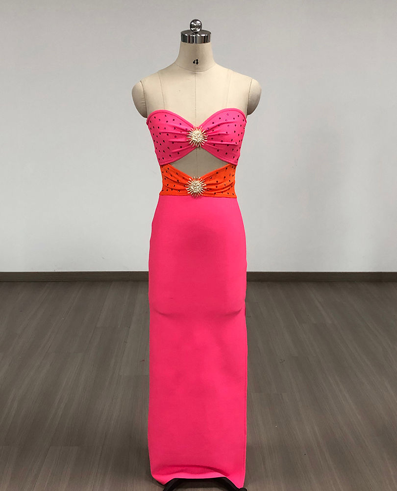 Black & Pink Strapless Hollow Out Rhinestone Dress, High Slit, Slim, Ankle-Lengt