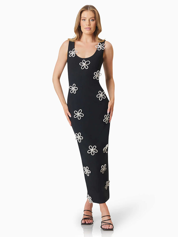Black Sleeveless Ankle-Length Dress, Rhinestone Floral Applique, Knit, Slim Fit