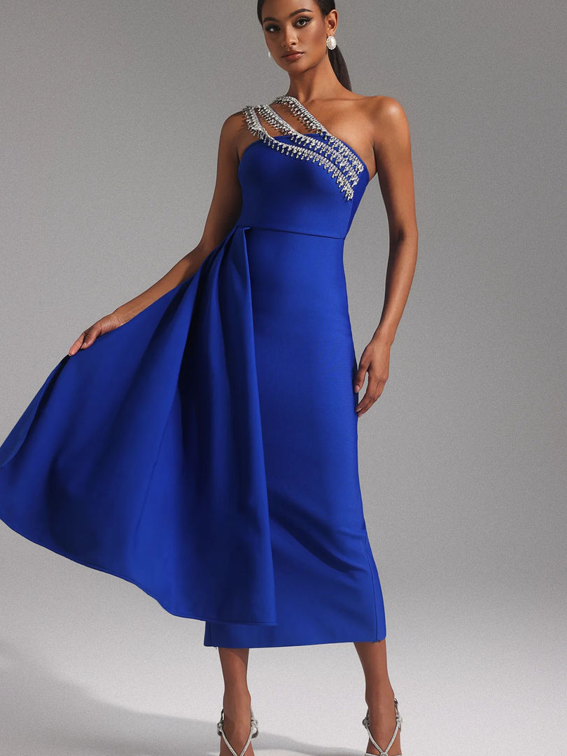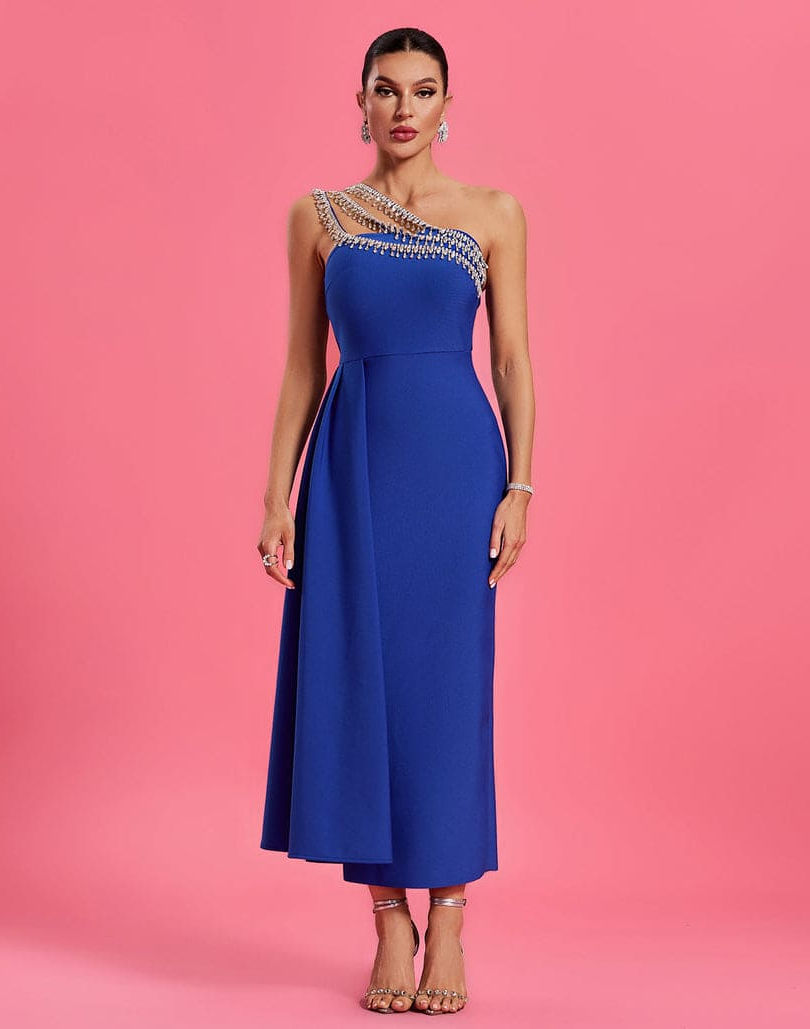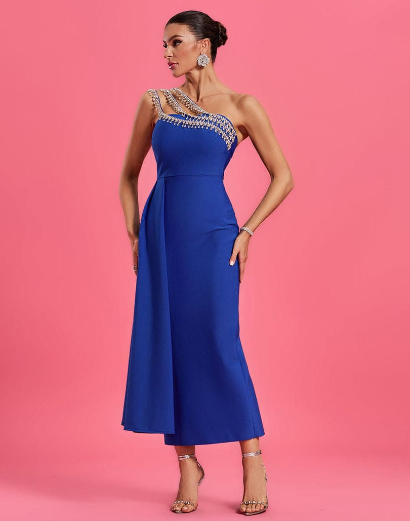 Tags:blue one shoulder midi dress, crystal embellished dress, backless party dress, sexy club dress women, slim fit knit dress, ankle length evening dress, one shoulder cocktail dress, high stretch bodycon dress, summer 2025 dress trends, fashion forward event dress, glamorous occasion dress, women's designer inspired dress, blue crystal dress for party, unique one shoulder dress.