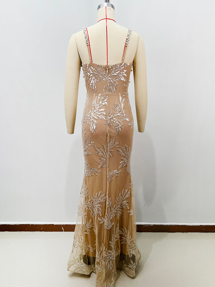 Formal Mermaid Gown, Sequin Beaded Prom Dress, Spaghetti Strap Beige Nude