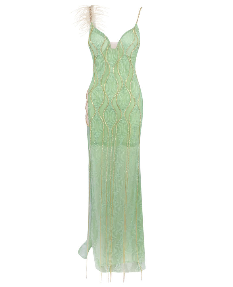 Feather Green Gown Dress with Spaghetti Strap, Tassels, High Slit & V-Neck, Knit
