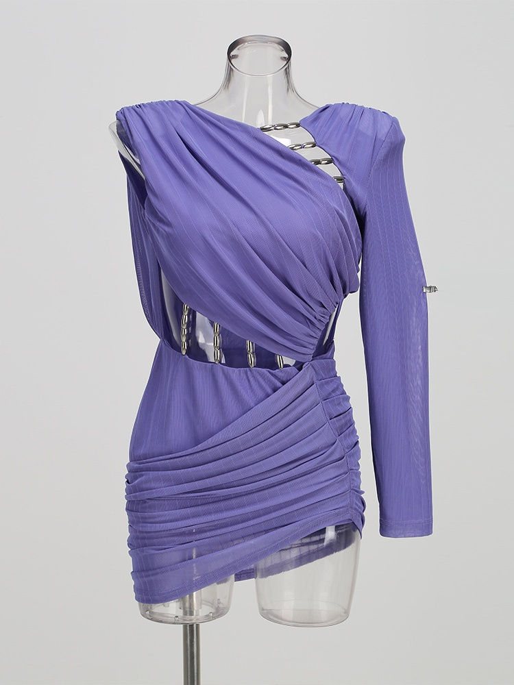 One-Shoulder Mini Dress, Cutout Club Party Attire, Purple with Chain Detail