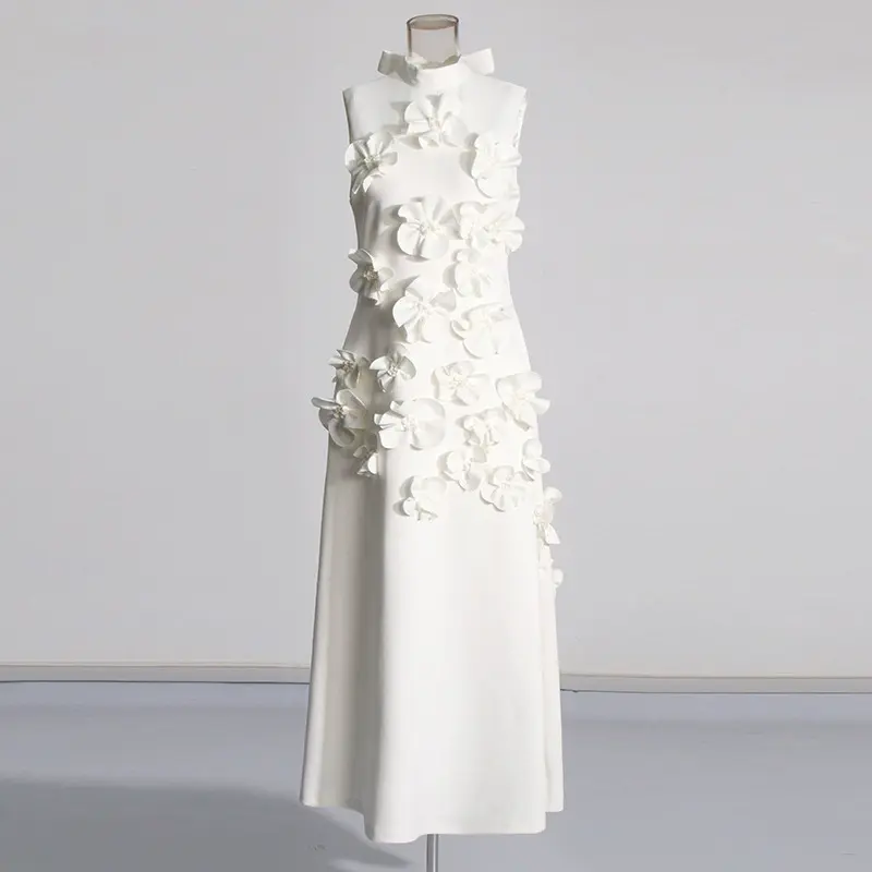 Turtleneck Sleeveless Long Dress, High Waist Straight Fit, Patchwork Appliques