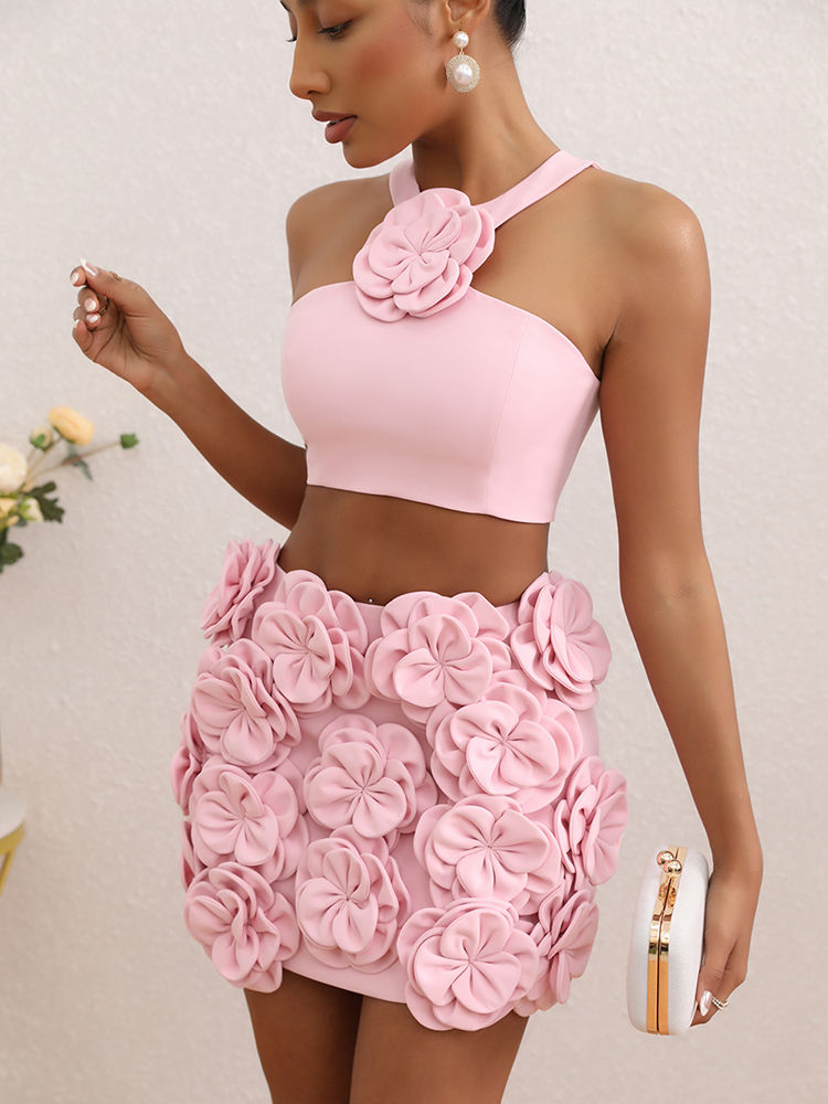 Pink Halter Neck Sleeveless Bodycon Mini Dress Floral 2 Piece Outfit with Zipper