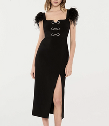 Square Neck Sheath Dress, Mid-Calf Cocktail Attire, Black Feather Bandage