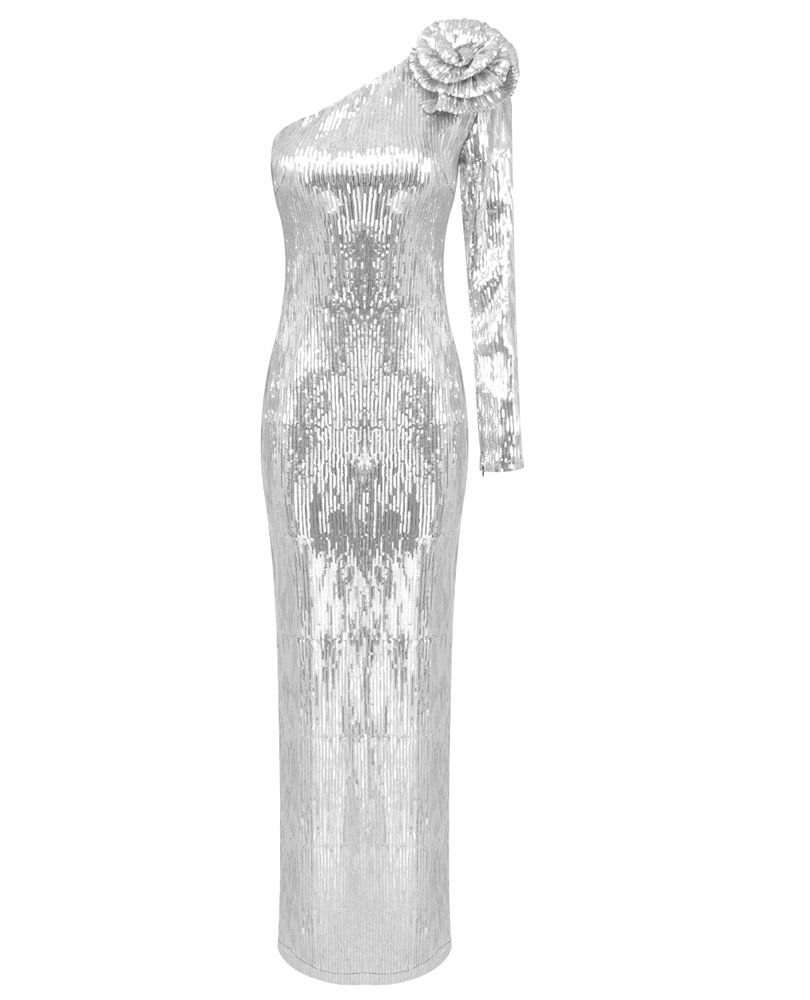 Silver Sequins Structured Flower Long Dress Slanted Collar One Sleeve Knit Dress