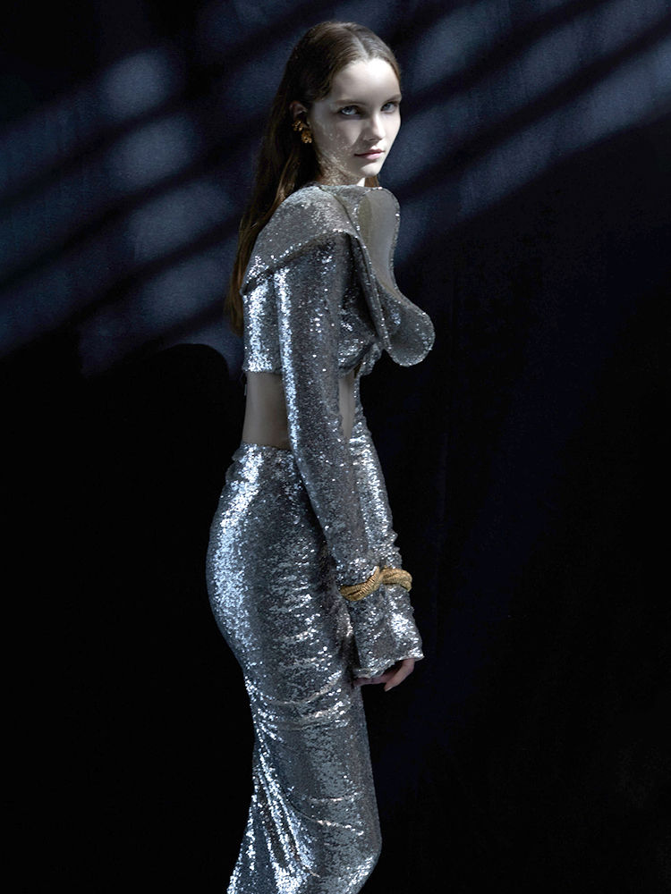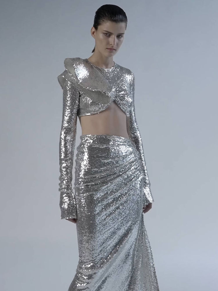 Silver Sequins Two Piece Set, Knit Short Top, Long Sleeve, Long Dress with Zippe