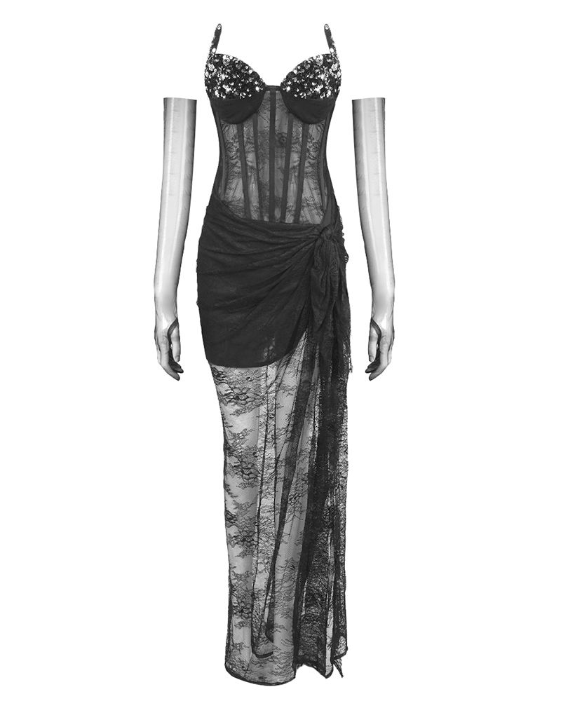 Strapless Black Maxi Dress, Lace Split, Long Bodycon, Mesh, Knit, Embroidery, Zi