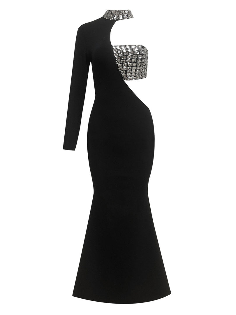 Tags: black one shoulder maxi dress, asymmetric long sleeve dress, floor length sheath dress, slim fit formal dress, diamond detail evening gown, sexy club dress for women, knit maxi dress with zipper, all season formal dress, middle age women's dress, stylish black mermaid dress, long sleeve evening dress with sparkle, one shoulder gown for special occasions, black tie event dress, elegant floor length dress.