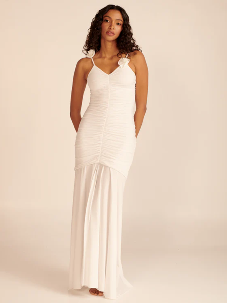 V-Neck Mermaid Dress, Ankle-Length Spaghetti Strap Gown, Floral Split Hem