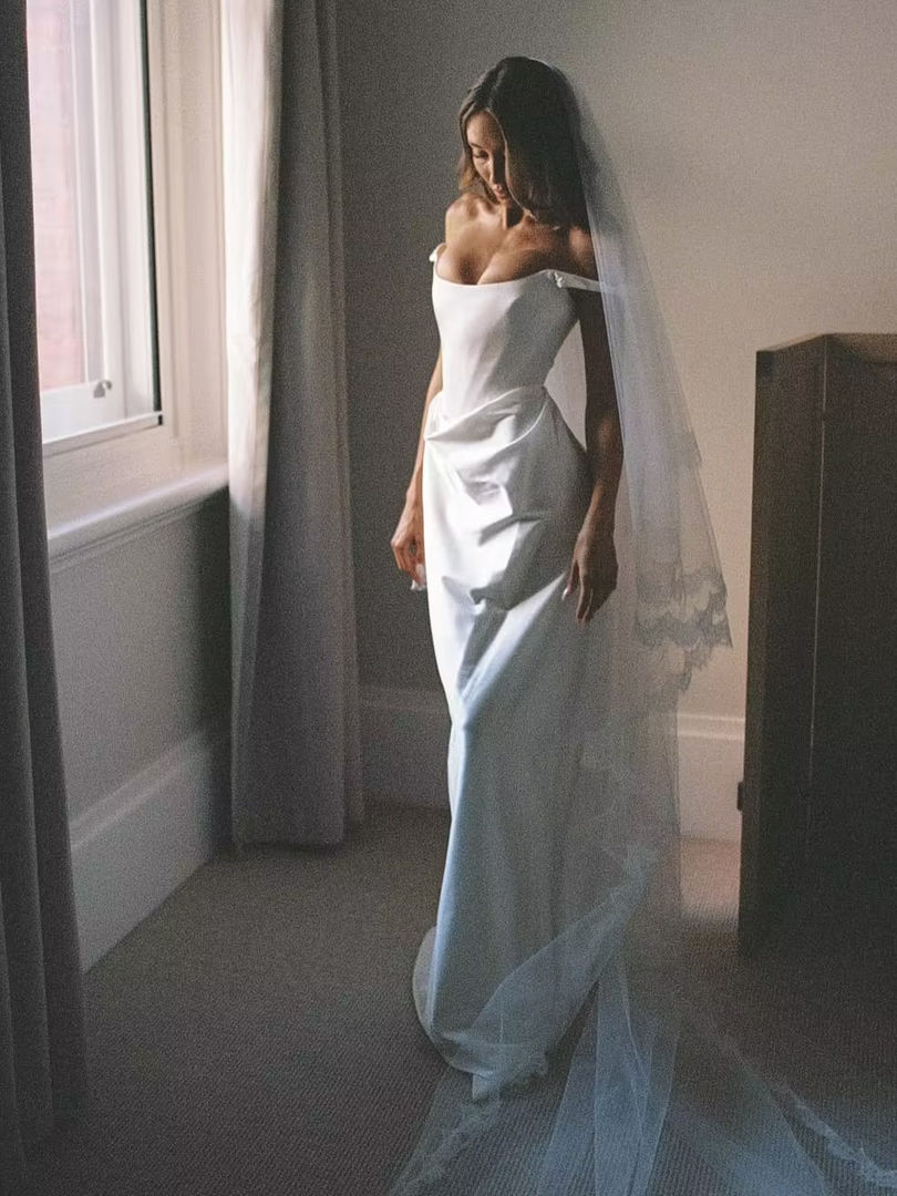 - A birdcage veil or a simple pearl headband to complement the modern-classic style.