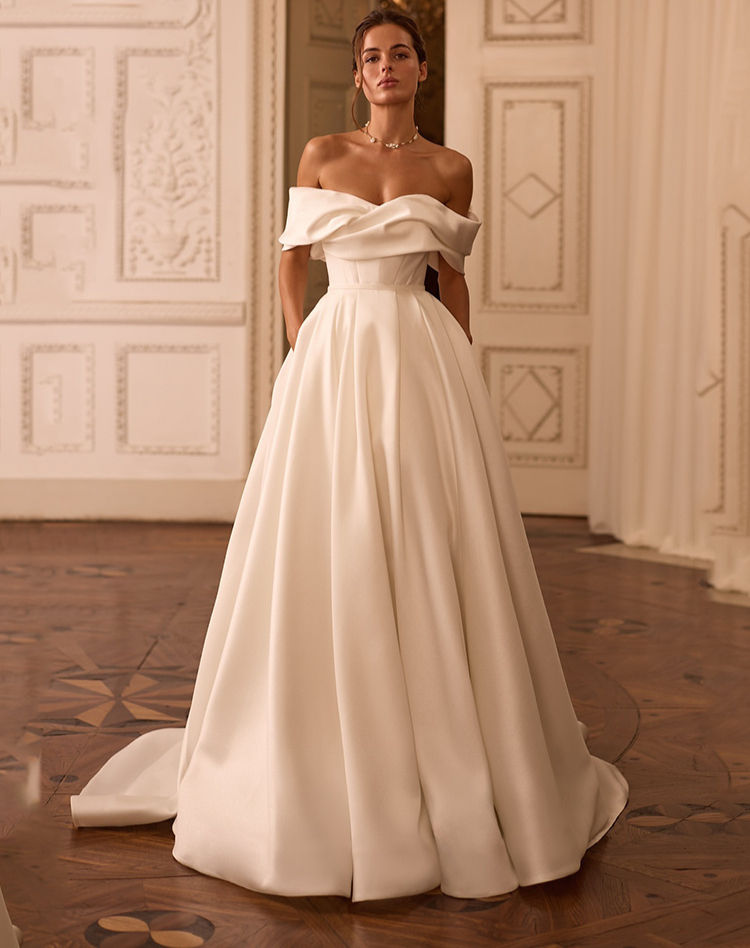 Custom-made A-Line Wedding Dress, Off The Shoulder Bridal Gown, Ivory Satin