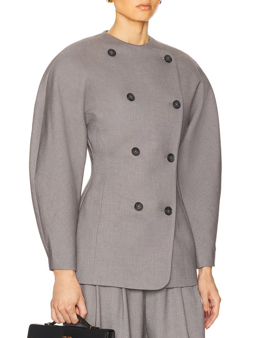 Two Piece Set, Long Sleeve Coat with High Waist Wide Leg Trousers, Gray