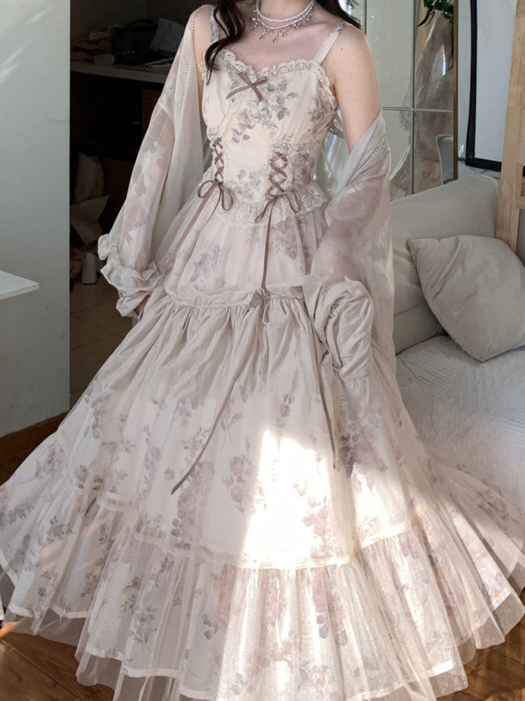 Floral Print Midi Dress, Sleeveless A-Line, Spaghetti Strap, Lace, Ruffles, Mesh