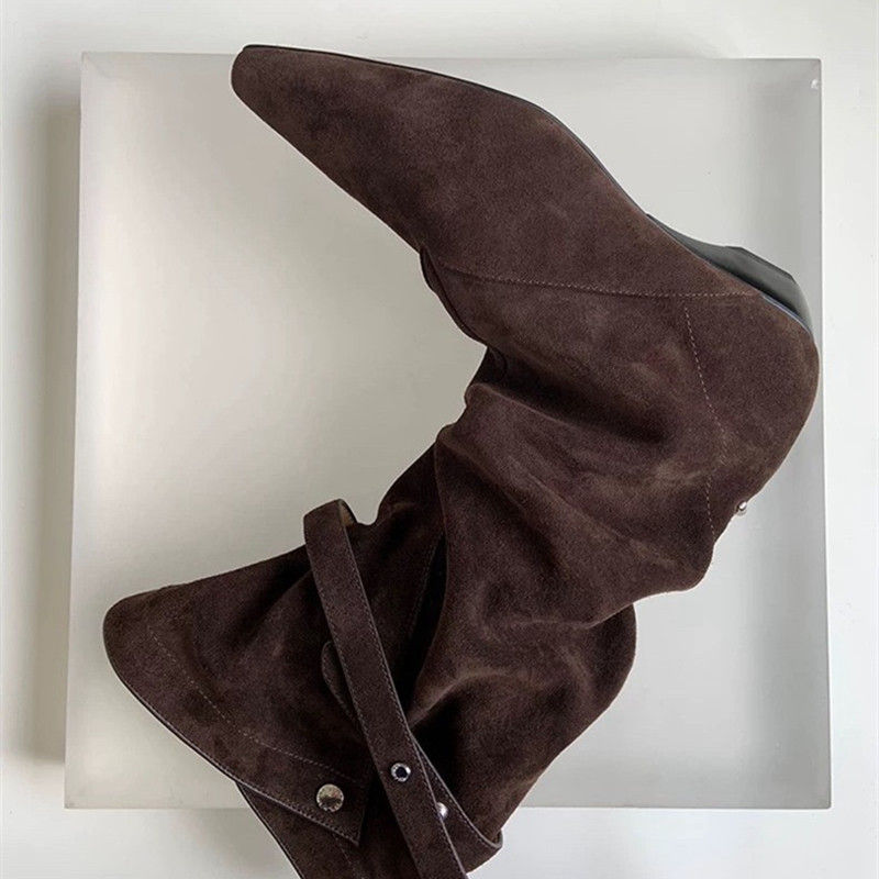 Modern Mid-Calf Boots, Pointed Toe High Heels, Pleated Faux Suede Slip-On