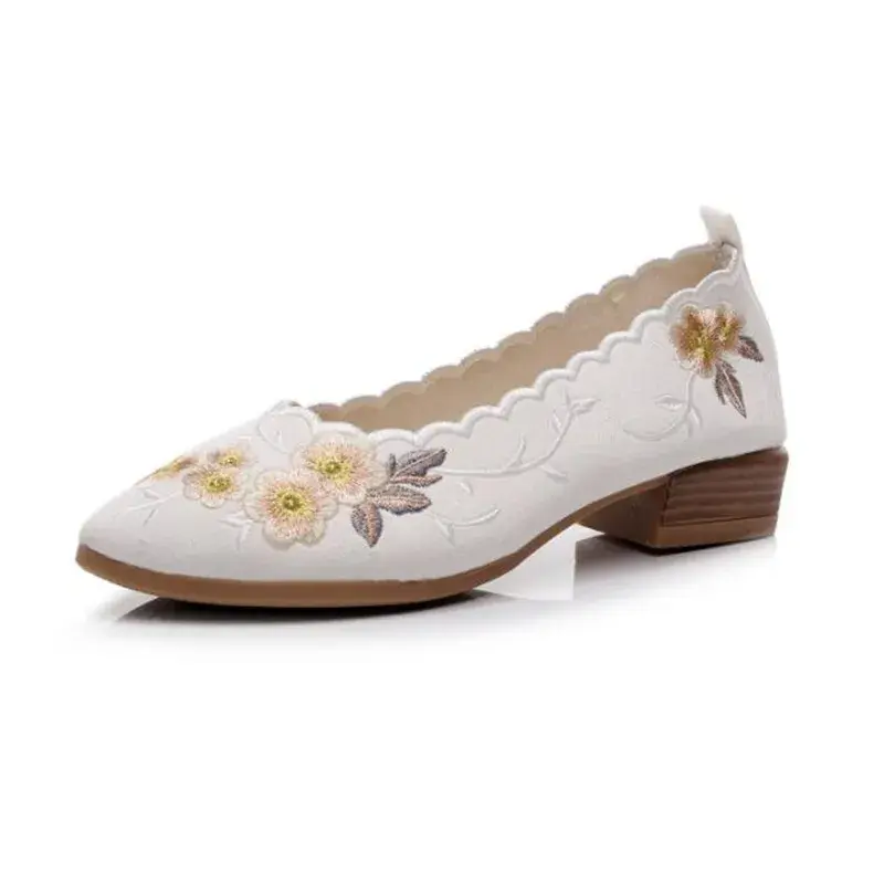 Vintage Floral Embroidered Pointed Toe Loafers - Slip-On Pumps