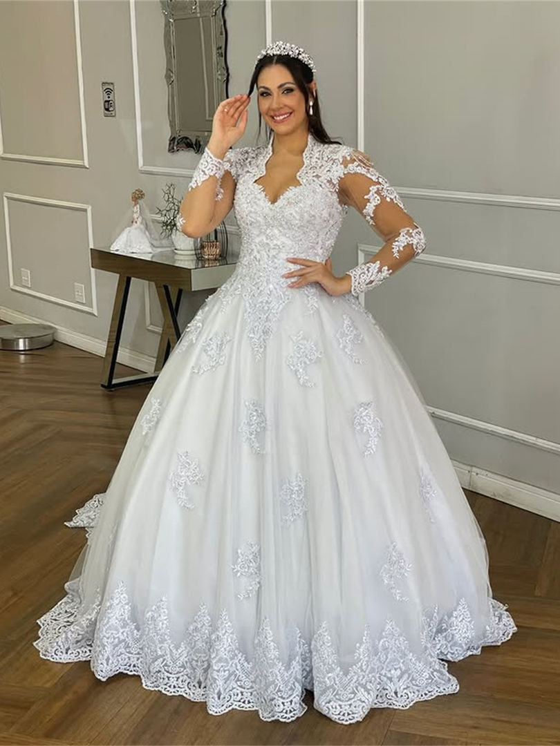 Lace Applique V-Neck Ball Gown Wedding Dresses Long Sleeves Pleat Sweep Train Ra