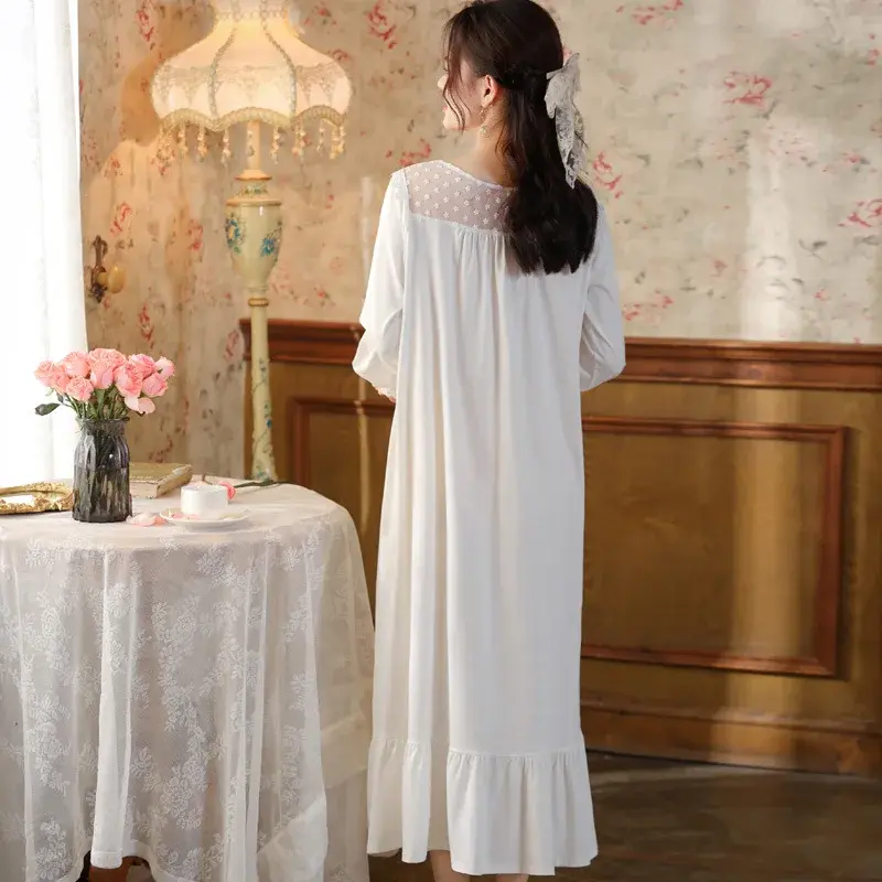 White Cotton Lace V-Neck Nightgown Long Sleeve Vintage Fairy Sleepwear