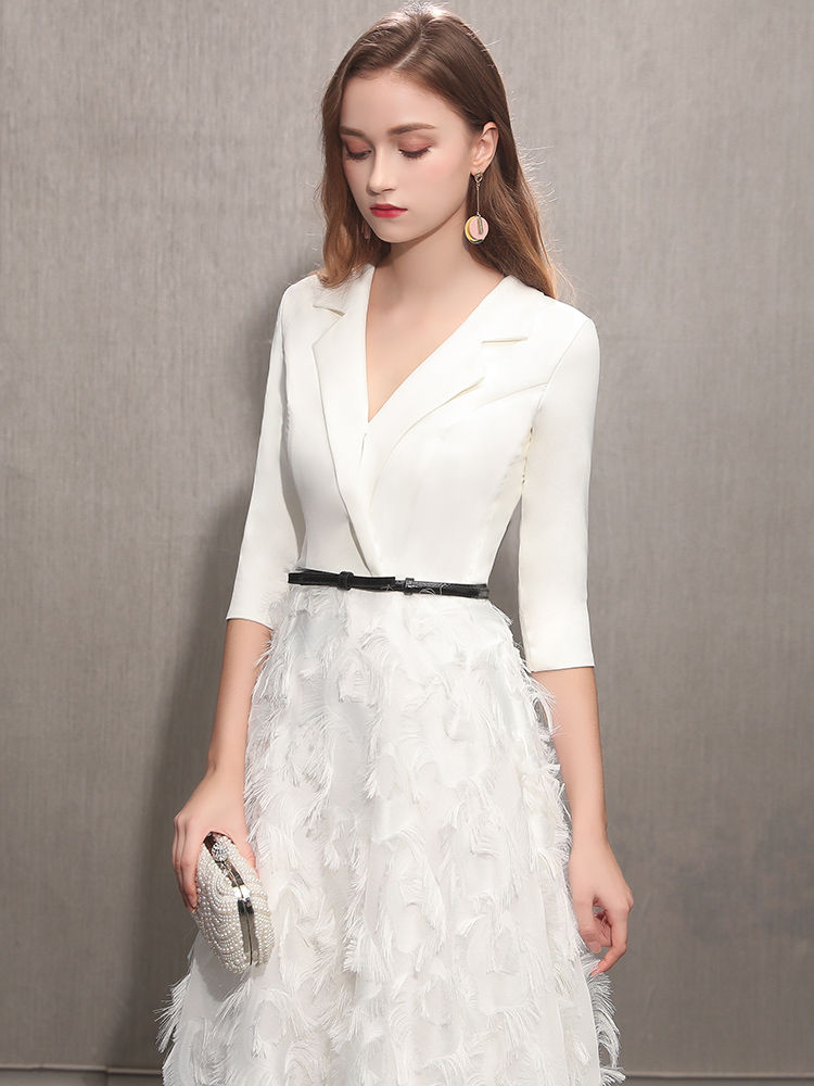 White Lace Evening Dresses Long Formal A-Line Polyester Rayon V-Neck Knit Gowns