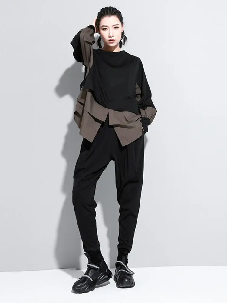 Women Army Green Irregular Split Joint Big Size T-Shirt New Round Neck Long Sle