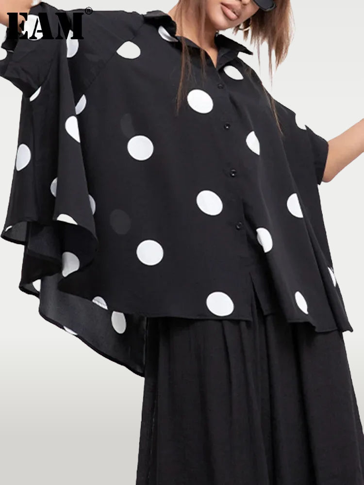 Women Black Big Size Dots Causal Blouse New Lapel Half Sleeve Loose Fit Shirt F