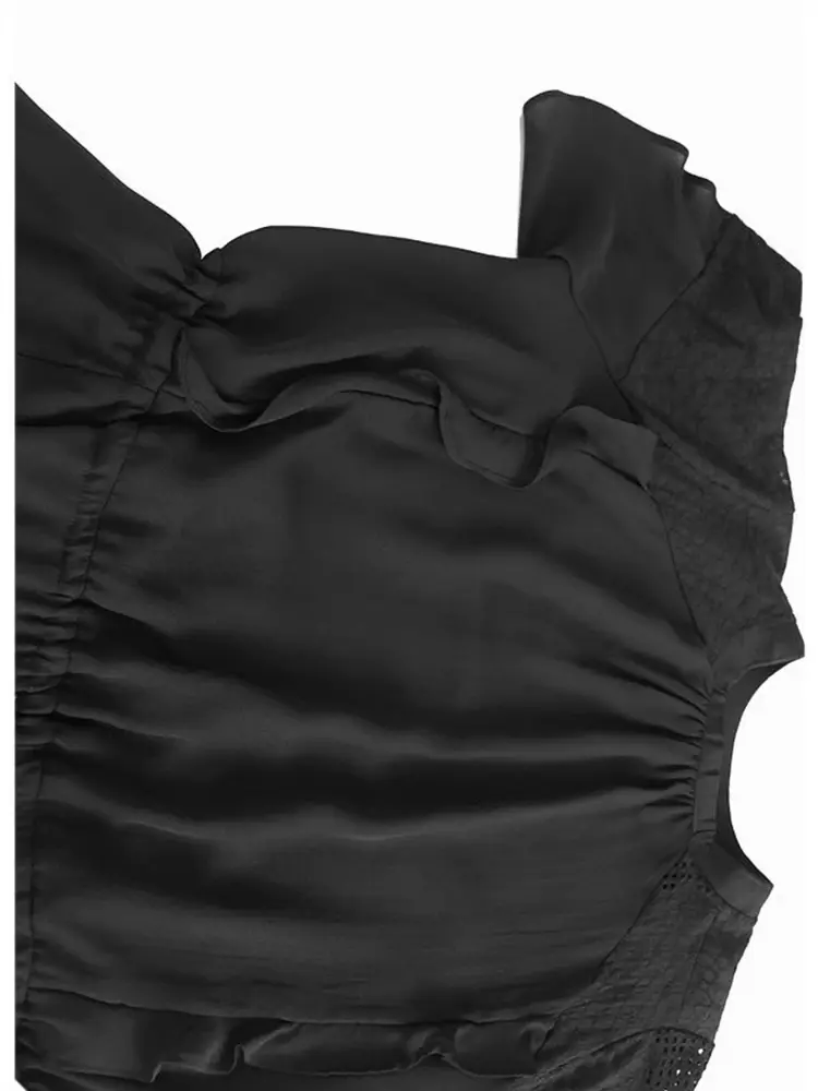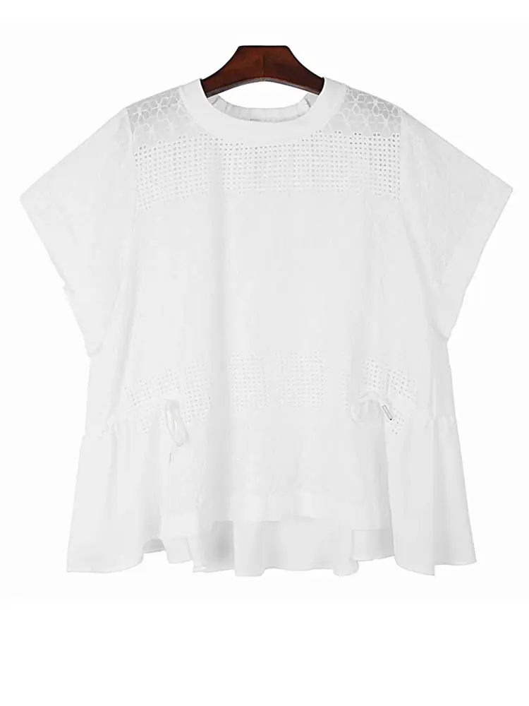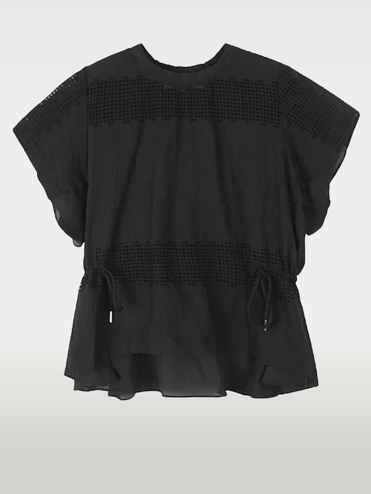 Women Black Hollow Out Drawstring Big Size T-Shirt New Round Neck Short Sleeve