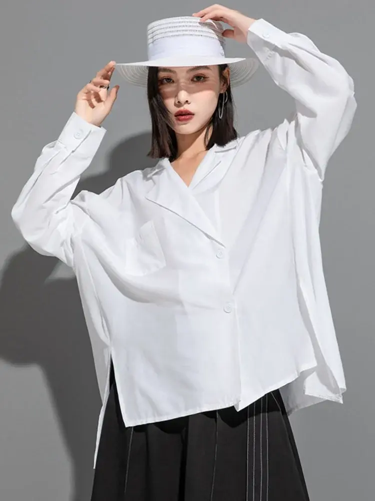 Women Black Irregular Big Size Casual Blouse New Lapel Long Sleeve Loose Fit Sh