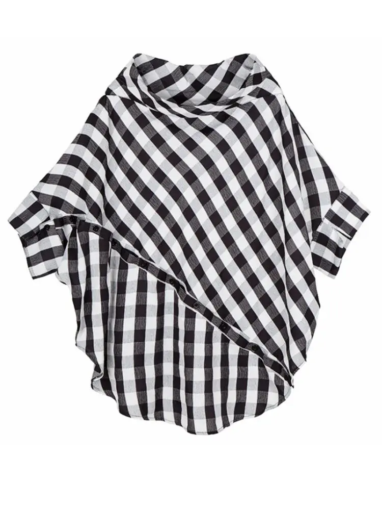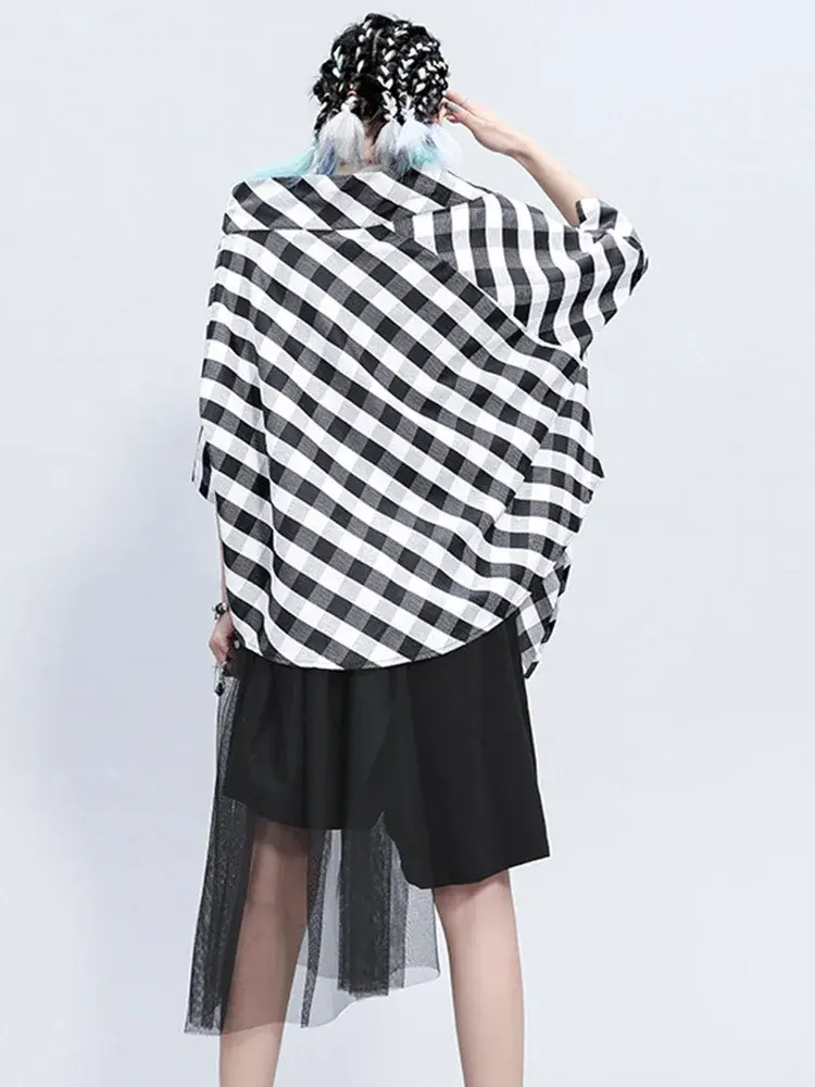 Women Black Irregular Plaid Big Size Blouse New Slash Neck Batwing Sleeve Loose
