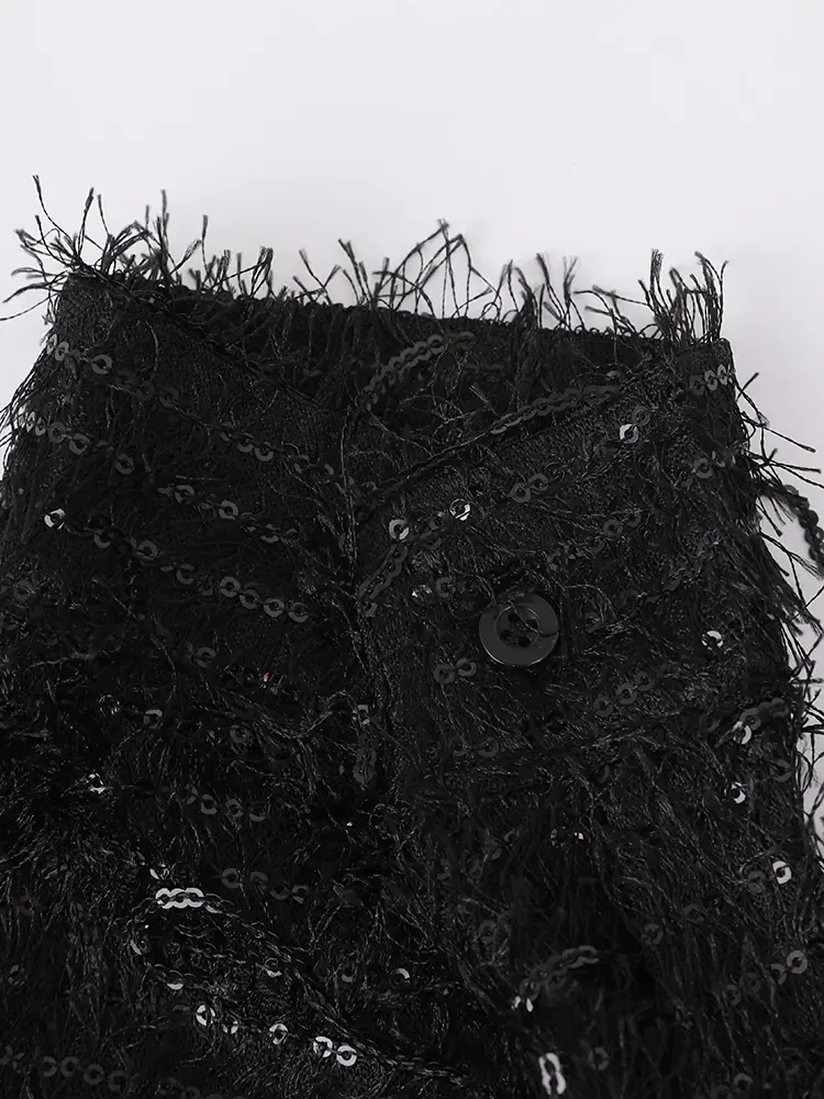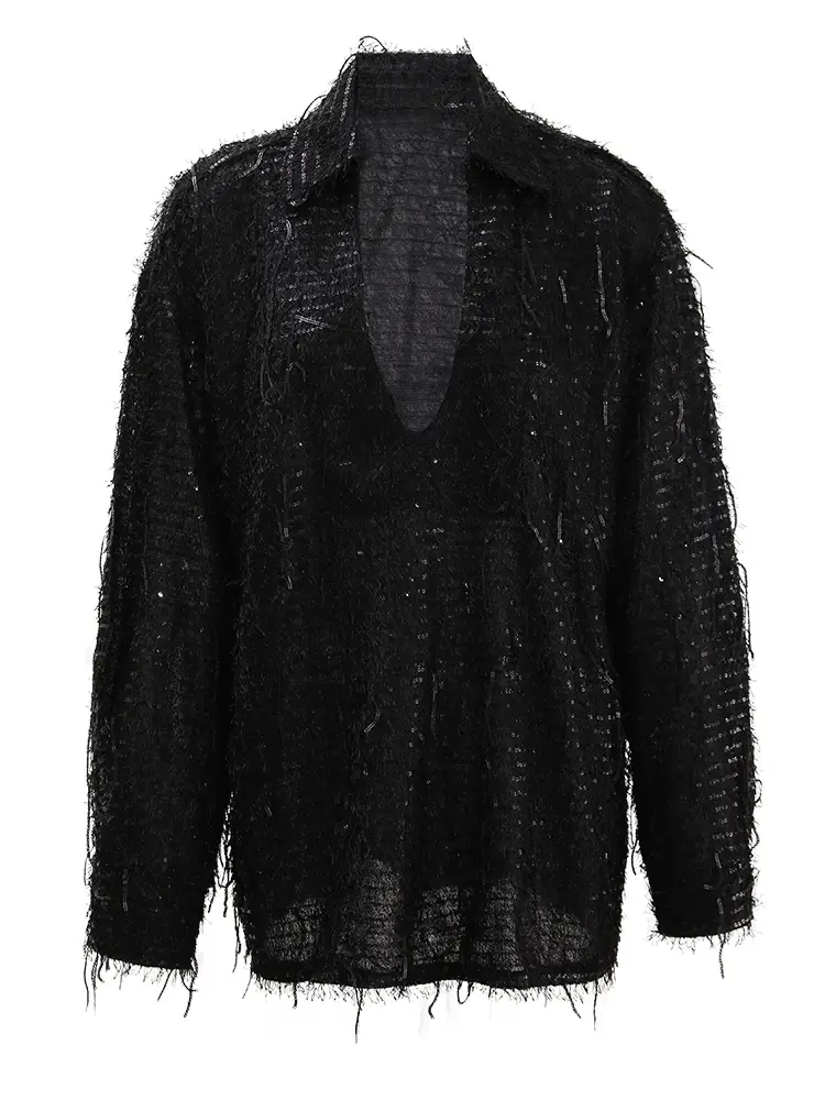 Women Black Sequins Tassels Big Size Shining Blouse New V-Neck Long Sleeve Shir