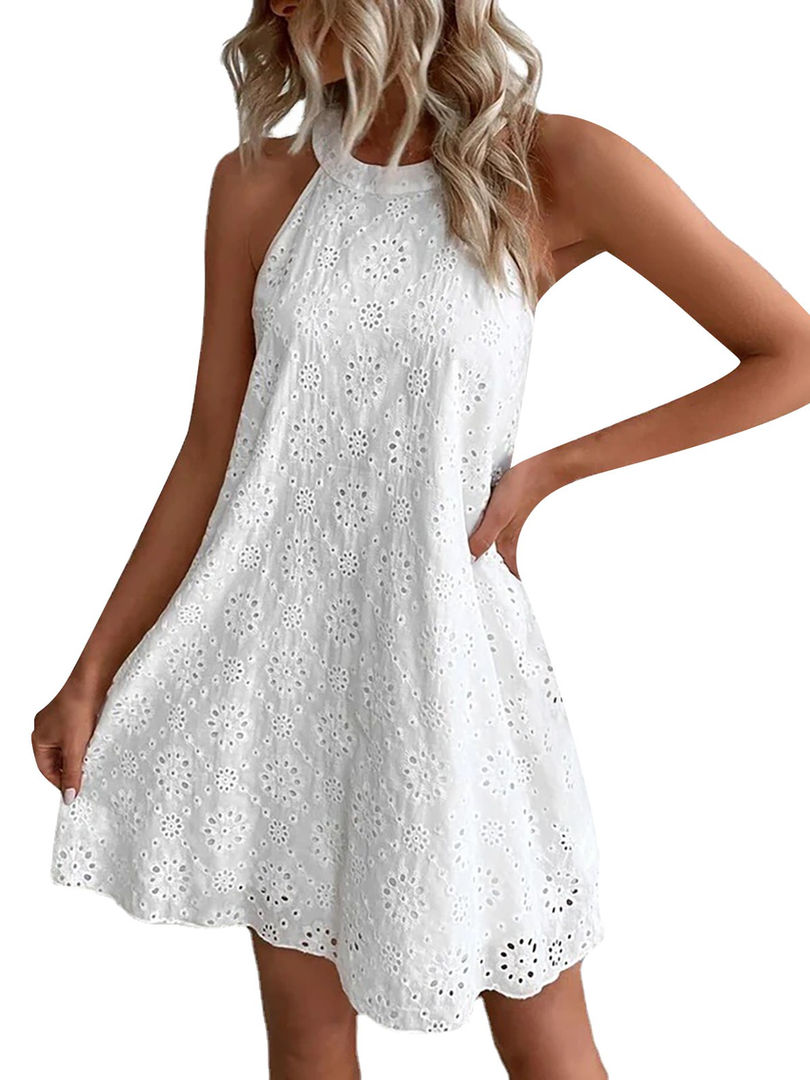 Women Eyelet Hollow Out Sexy White Dress Halter Sleeveless Tank Plus Size Mini D