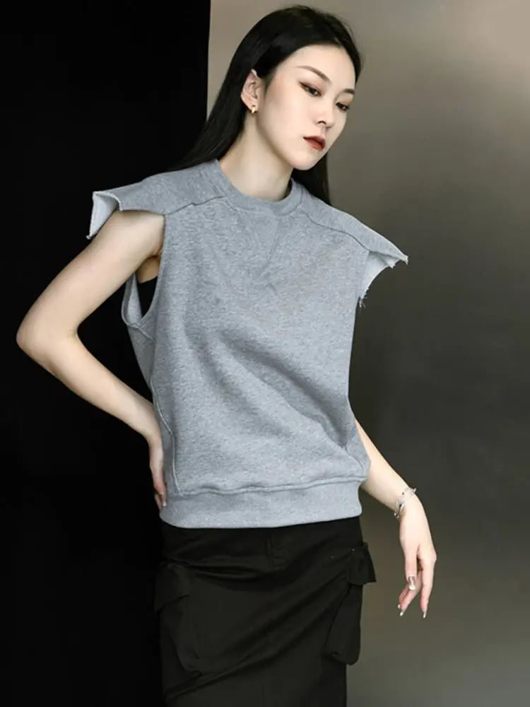 Women Gray Black Shoulder Shaped Casual T-Shirt New Round Neck Sleeveless Fashi