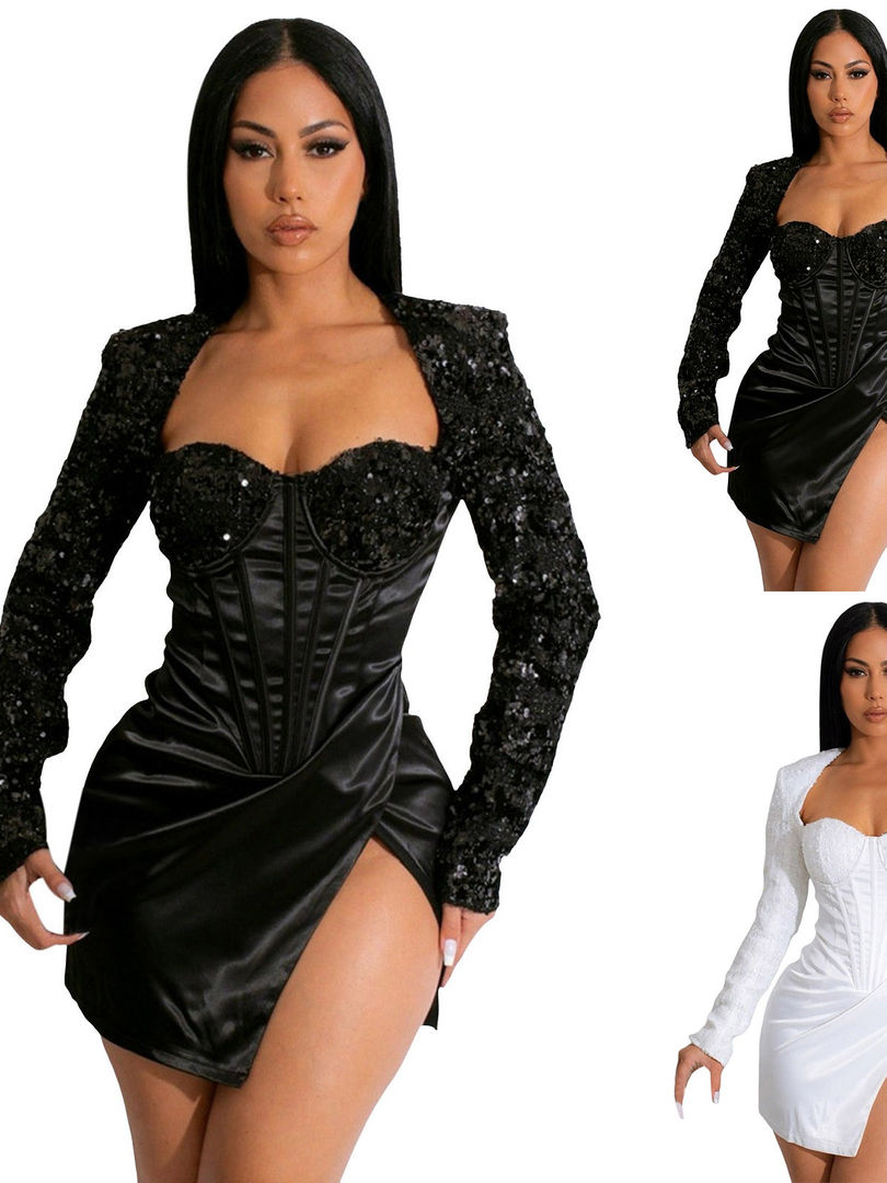 White Sequins Dress Evening Party Square Corset Side Slit Knee Length Sleeveless