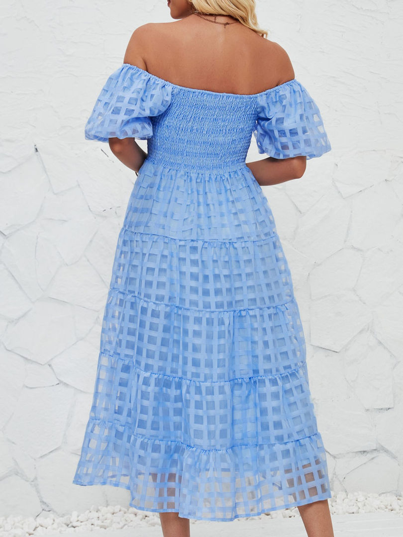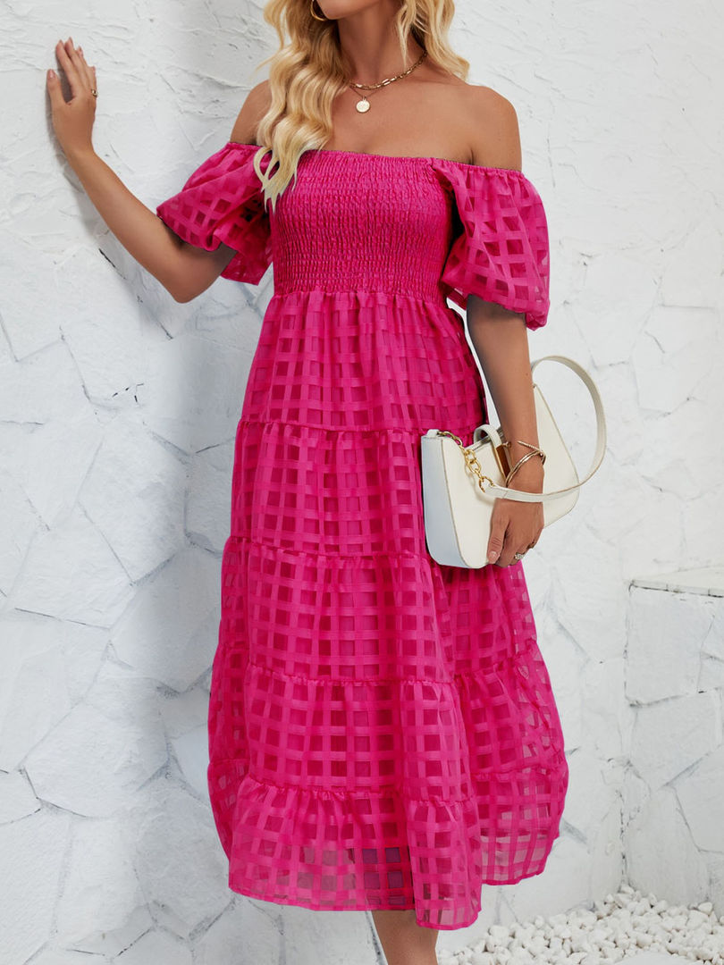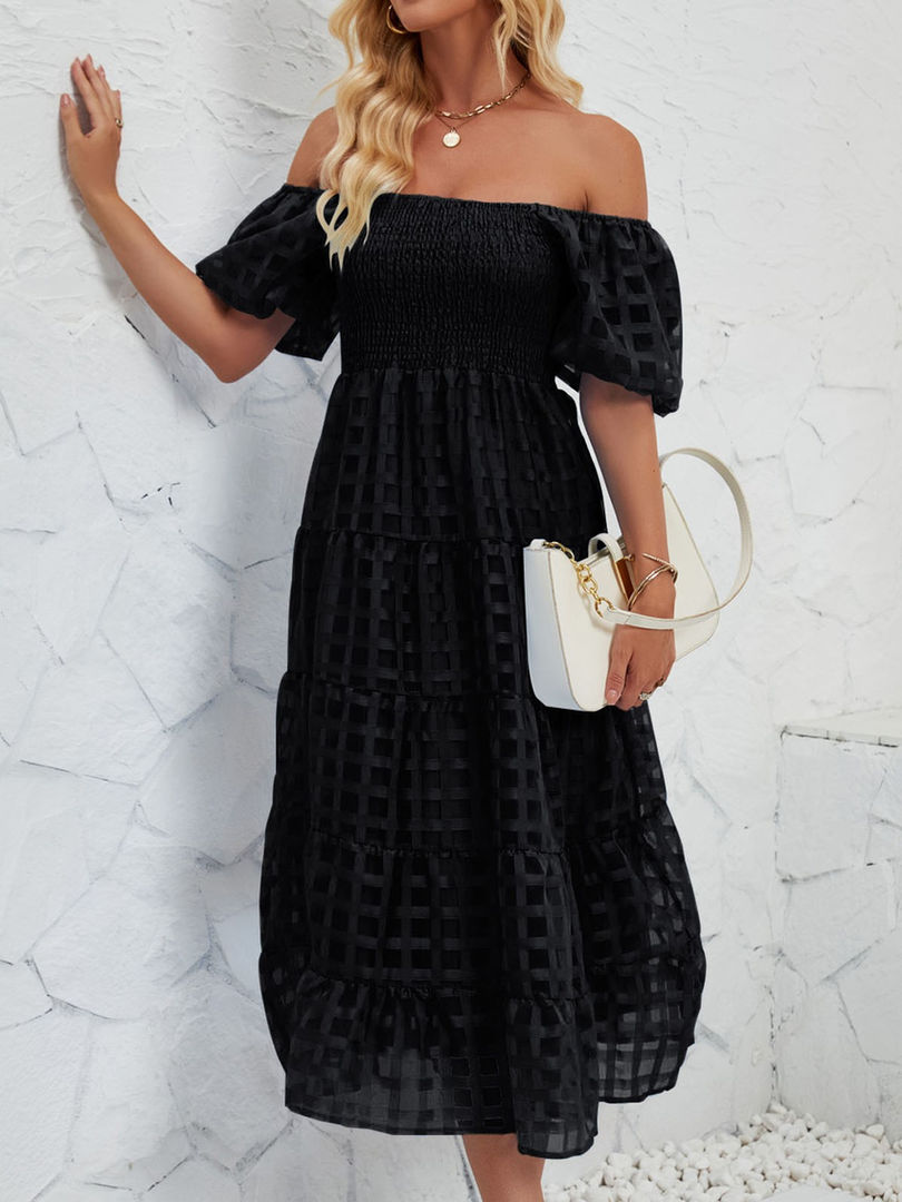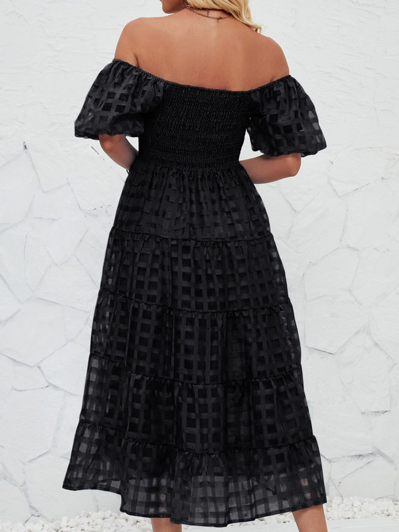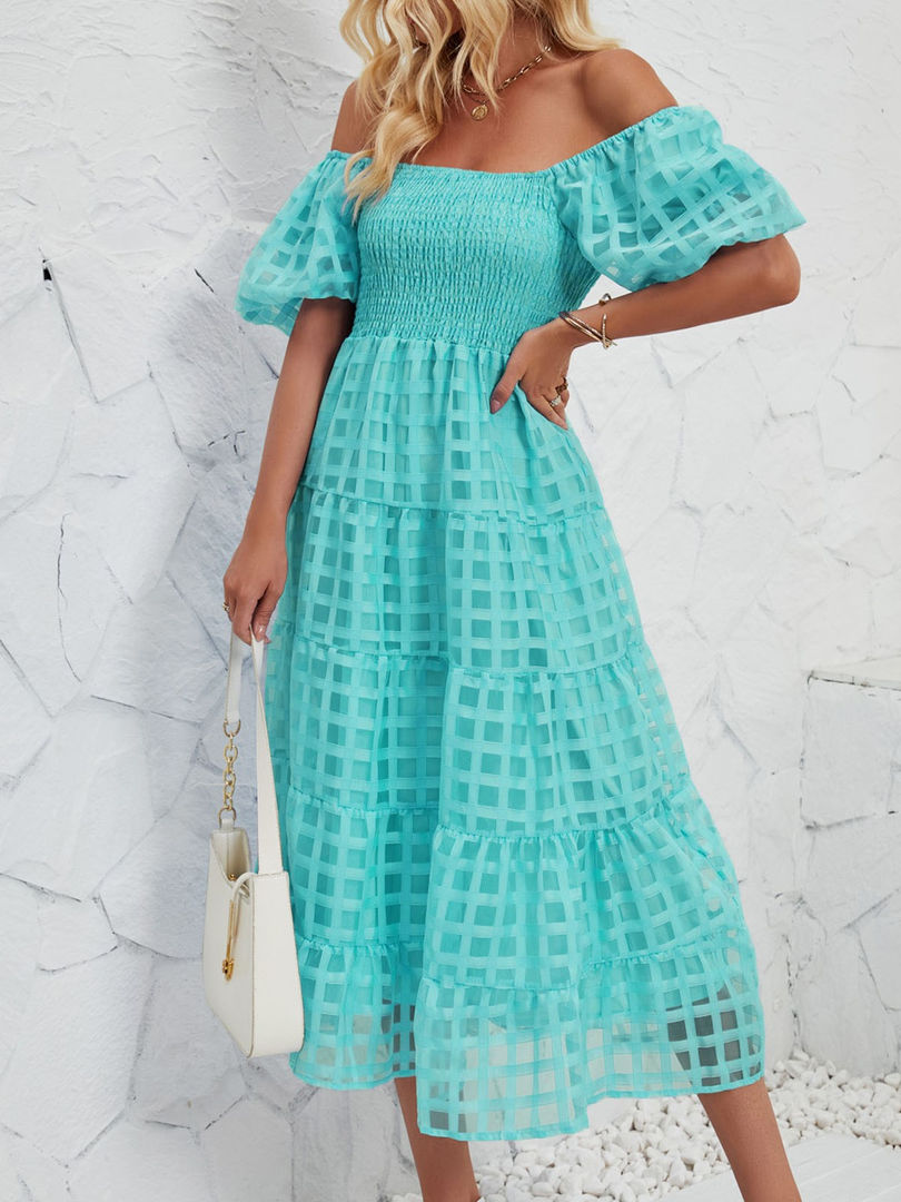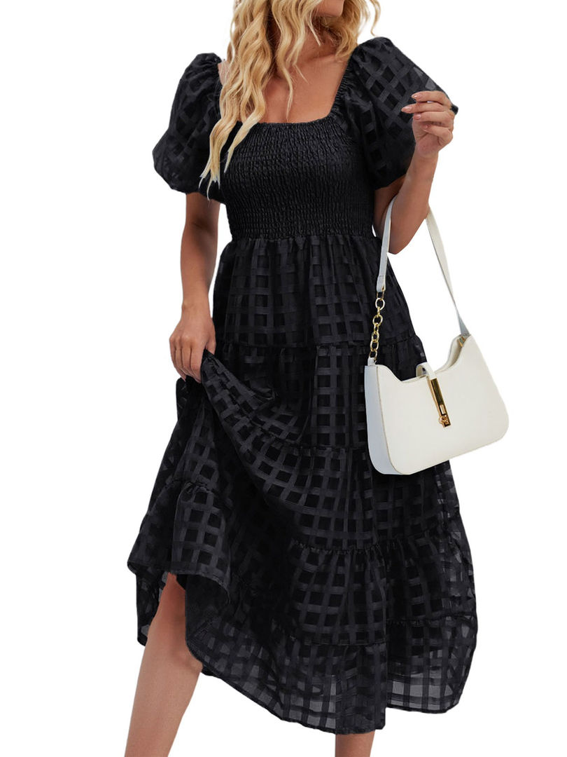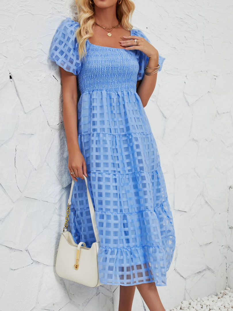 Square Collar Short Sleeve Mid-Calf A-Line Loose Fit Party Beach Vestido Midi