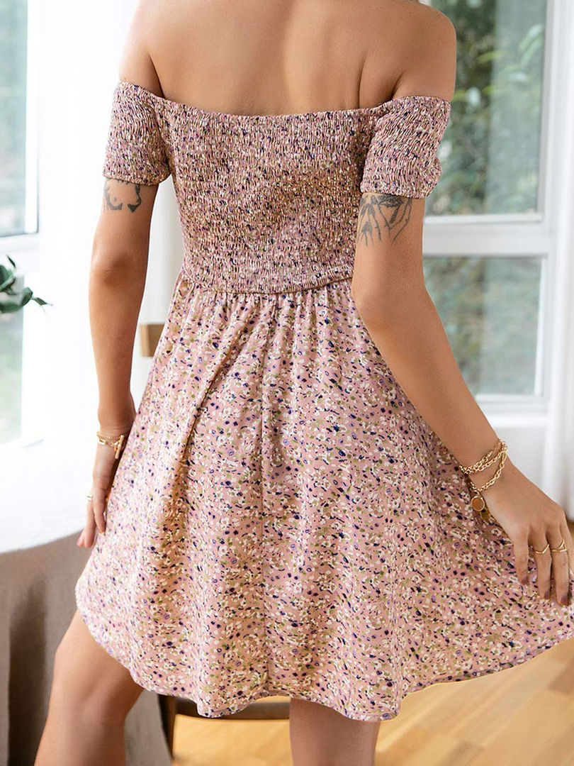 Off Shoulder Print Mini Dress Short Sleeve Swing A-Line Knee-Length Stretch