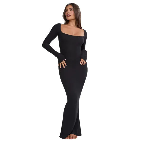 This is a women's ankle-length bodycon dress with a slim fit. It features a comfortable knit construction and a classic O-neckline with wrist-length sleeves. The solid pattern makes it a versatile piece for various looks.