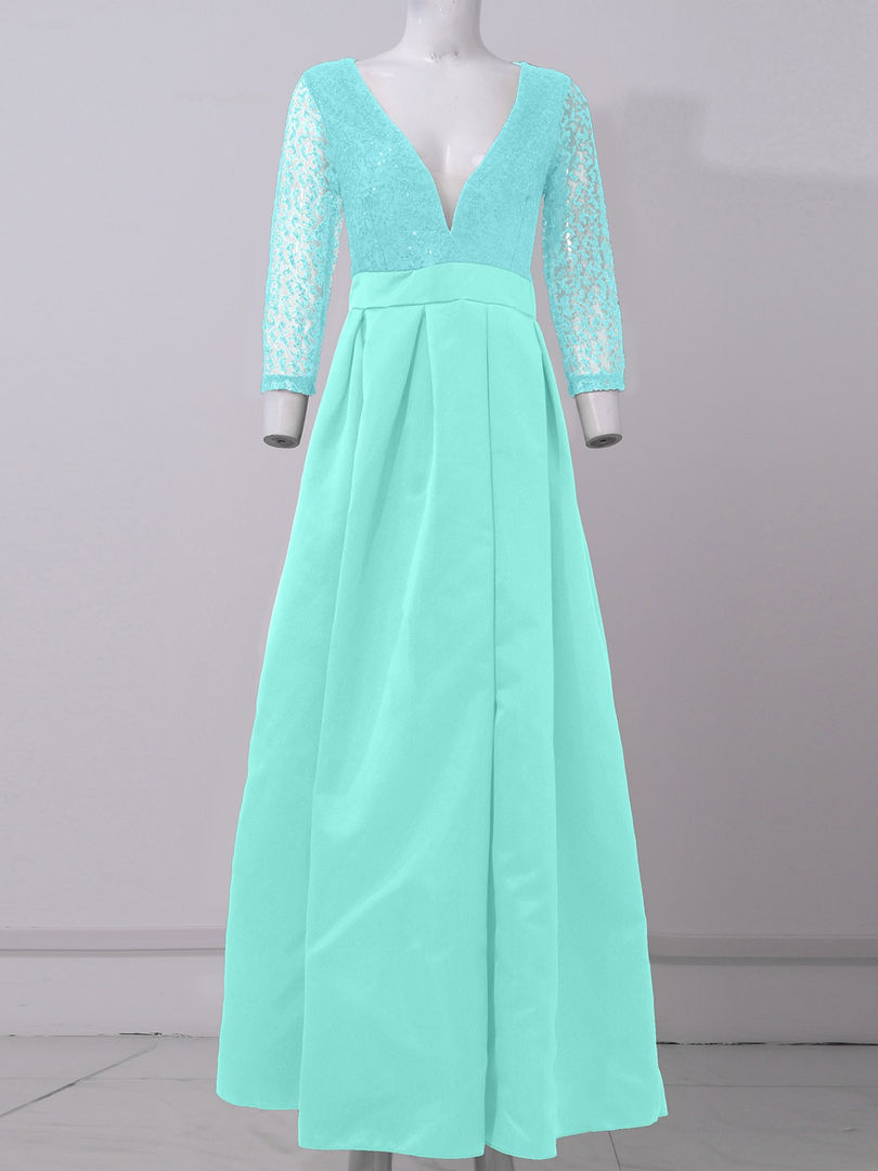 V-Neck Three Quarter Sleeve Pullover Floor-Length Solid Evening Party Formal