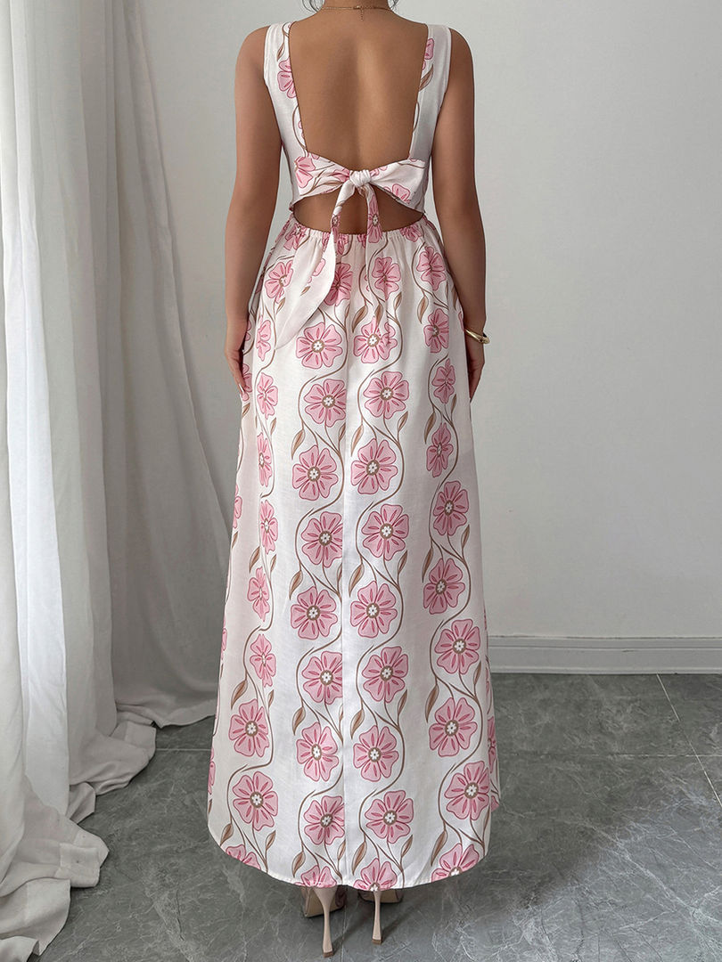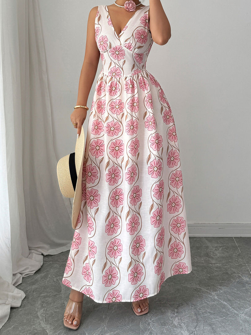 Floral Print Tank Dress Sleeveless Deep V Neck Flowy A-Line Ankle-Length Polyest