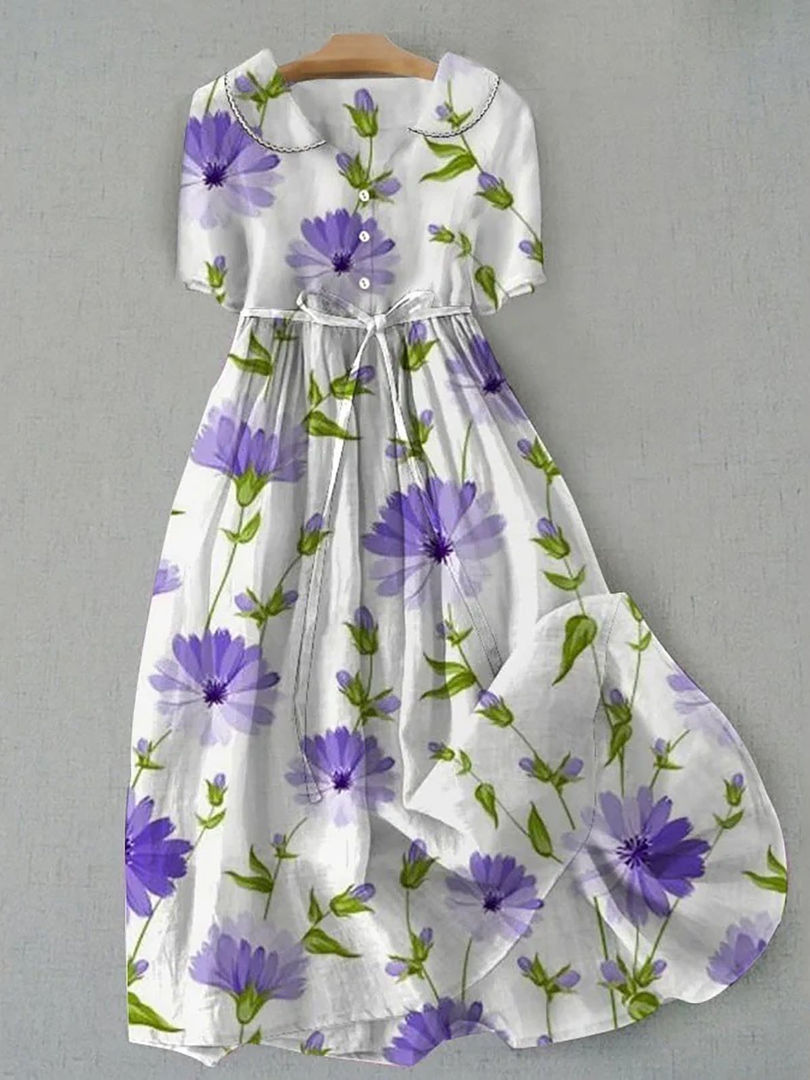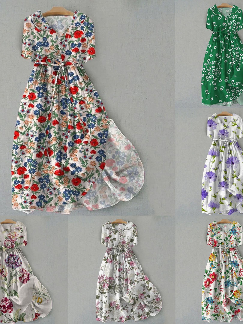 women's summer print dress, A-line knee-length dress, O-neck short sleeve dress, casual polyester dress, high stretch summer dress, pullover print dress, sash waist casual dress, comfortable summer outfit, everyday women's dress, junior women's dress, natural fiber blend dress, easy wear summer dress, printed knee dress, regular fit summer dress.