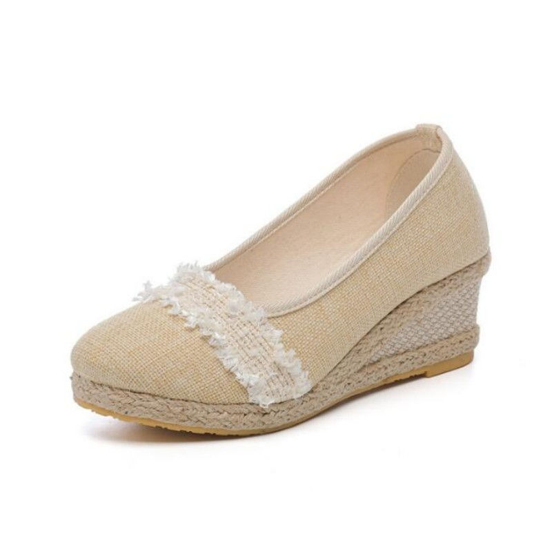 Round Toe Wedge Pumps, Slip-On Casual Loafers, Breathable Hemp, Weave Detail