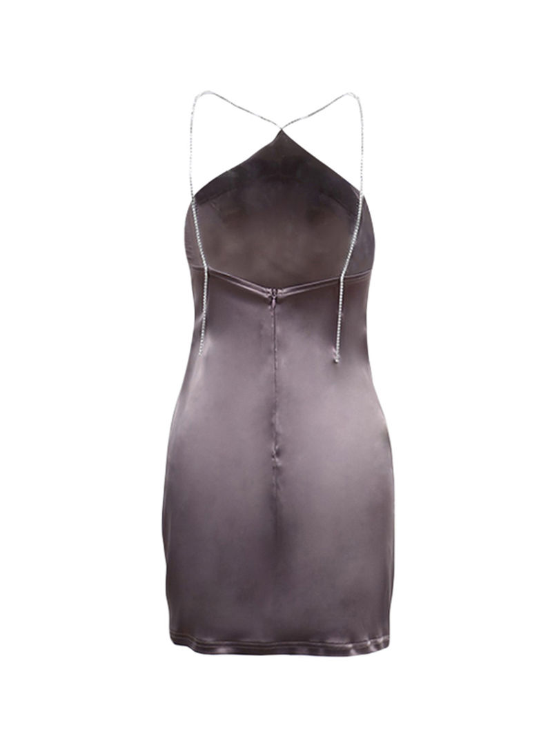 This is a sleek velvet mini dress, designed to highlight your silhouette with its sheath cut and above-knee length. It features a sophisticated halter neckline, adorned with subtle diamond embellishments, making it a standout piece for any occasion.