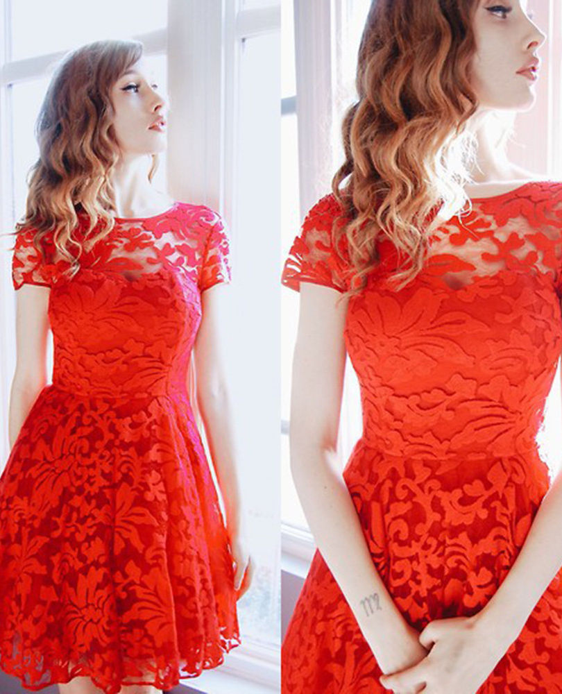 See-through Hollow Out Lace Short Sleeve A-Line Knee-Length Appliques Dress